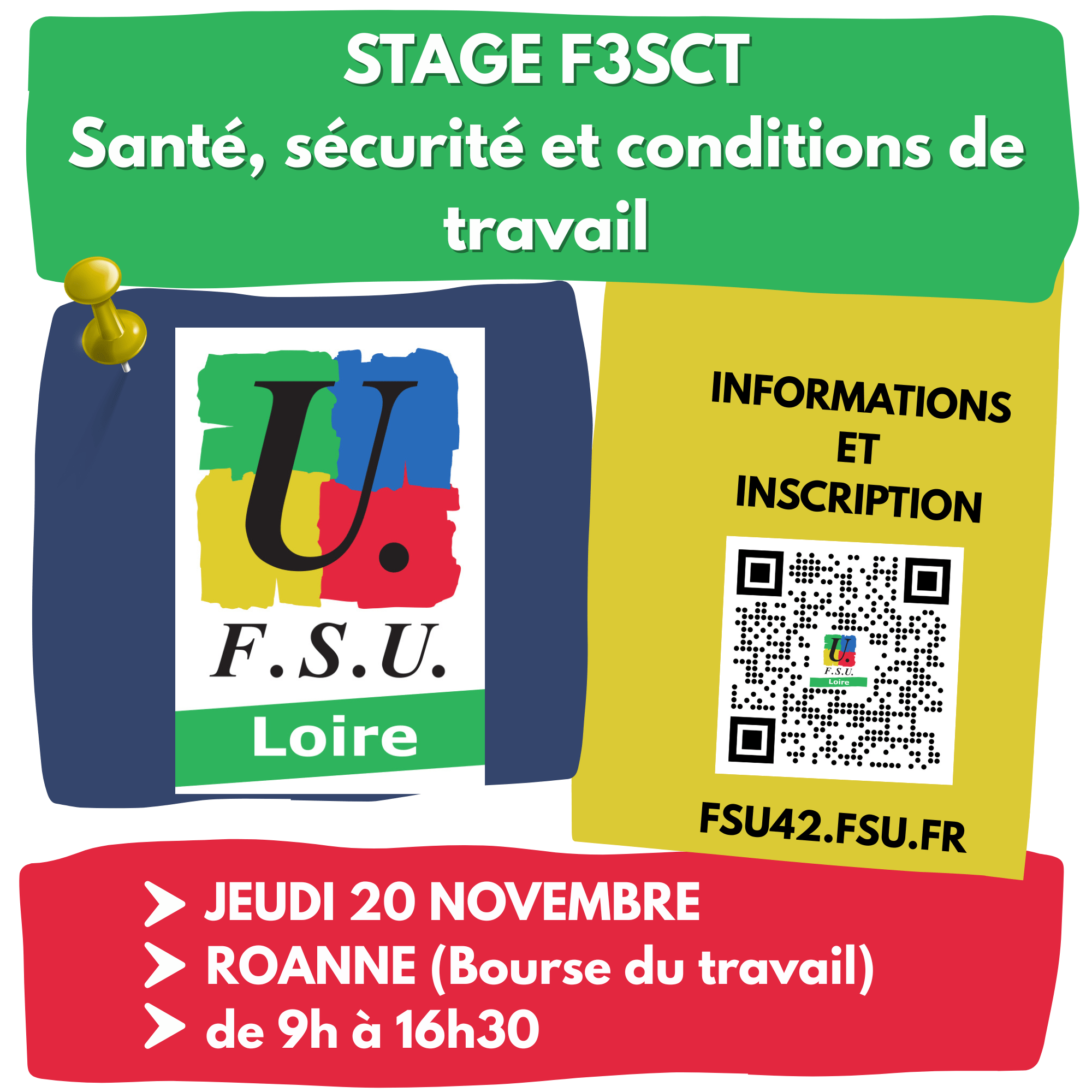 Agir pour prévenir la souffrance au travail : connaître ses droits, les outils et l’action de la F3SCT La FSU Loire organise à Roanne, le jeudi 20 novembre, de 9h à 16h, un stage départemental de formation syndicale, pour informer et échanger autour de la sécurité au travail et des conditions de travail. Les élu.es de la FSU interviennent en instance F3SCT (Formation Spécialisée Santé Sécurité et Conditions [...]