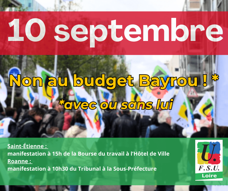 Pour un autre budget, l'intersyndicale appelle à la grève le jeudi 18 septembre. Manifestations dans la Loire : Roanne : modalités à venir Saint-Etienne : manifestation à 10h de la Bourse du travail en direction de la Sous-Préfecture